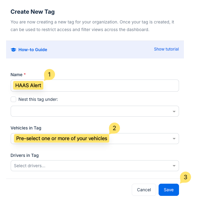 Adding a tag helps segment your vehicles into those activated with HAAS Alert and those that are not. Vehicles may be added or removed from a tag as needed, depending on your Safety Cloud® subscriptions.
