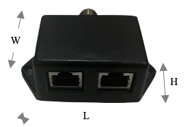 The splitter box has a female M12 connector on one end that screws into the 3-Conductor Cable, and 2 x RJ45 ports for connecting to Ethernet cables. There are two mounting holes for screws, if needed.
