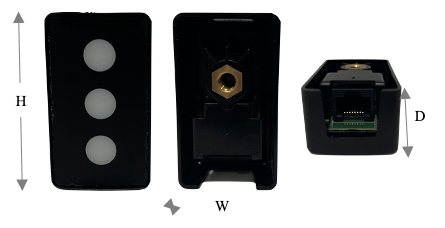 A molded, hard plastic rectangular box containing 3 LEDs that illuminate when it receives the trigger signal from the Ericsson router. A standard 1/4-20 threaded screw hole in the back for secure mounting. Mounting hardware is included.